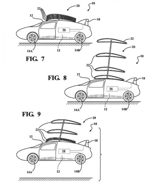 Вот и Toyota решила быть «в тренде» и запатентовала раскладное наращиваемое крыло для летающей машины (STACKABLE WING FOR AN AEROCAR). В патентной документации компании отмечается, что разработанная технология представляет собой конструкцию из четырех крыльев, сложенных друг на друге и расположенных на крыше автомобиля. В момент подготовки к полету каждое крыло поочередно выдвигается вверх и после этого аэромобиль разгоняется и взлетает.