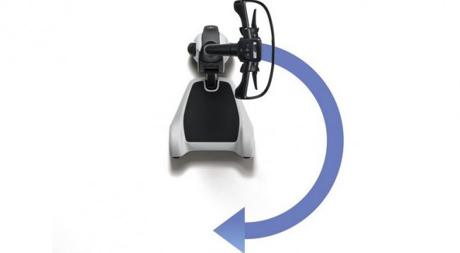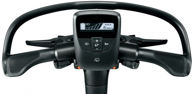 В верхней части рулевой стойки размещен небольшой дисплей и панель управления, на которой расположены кнопки регулировки скоростного режима, включения освещения и звукового сигнала. Переднее колесо электросамоката поворачивается на 180°, обеспечивая радиус разворота всего 0,59 м. Отличной маневренности также способствует возможность движения задним ходом.