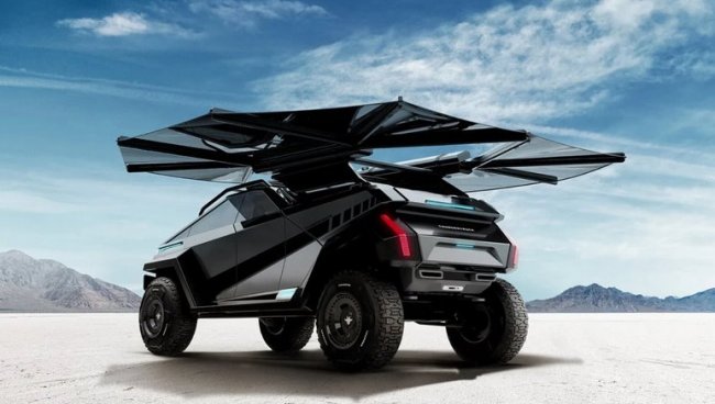 Новый концепт полностью электрического внедорожника получил огромную аккумуляторную батарею, угловатый и агрессивный дизайн (который во многом напоминает Cybertruck) и выдвижные солнечные панели для автономного питания. А в качестве опции, если пользователь пожелает увеличить запас хода и мощность привода, он может установить два дополнительных колеса и аккумулятор, которые собраны в виде самобалансирующейся съемной тележки, делающей машину полноприводной.