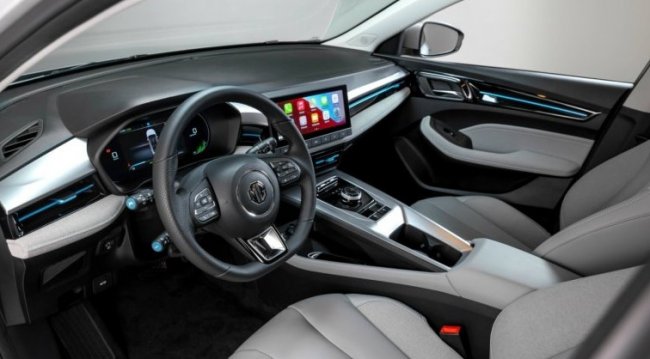 Интерьер MG5 Electric достаточно приятный и современный. В наличии виртуальная приборная панель 7-дюймов в глубоком козырьке, 10-дюймовый широкоформатный тачскрин-планшетного типа для навигации, настроек и мультимедиа, наклонный тоннель с шайбой регулировок, лаковые декоративные панели и контурная голубая подсветка.