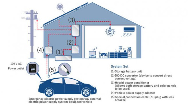 Используя адаптер питания, семейный электромобиль может «поделиться» своей энергией с системой электроснабжения дома с эффективностью 1,1 кВт⋅ч при 100 В (AC).