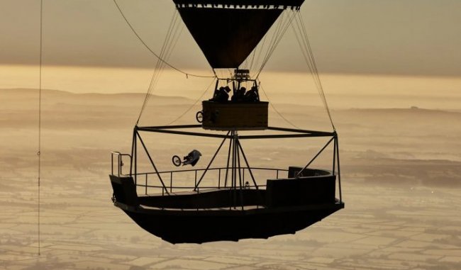 Компания Red Bull устроила очередной безумный эксперимент, в рамках которого профессиональный BMX-велосипедист Крисс Кайл выполнил серию трюков, находясь на высоте 600 м. Оригинальная трюковая чаша весит более 6 тонн, но при ее подъеме на грузовом вертолете создавался слишком сильный ветер. Поэтому специалистам из команды Red Bull Advanced Technologies пришлось изготовить чашу из композитных материалов, вес которых остался тайной.