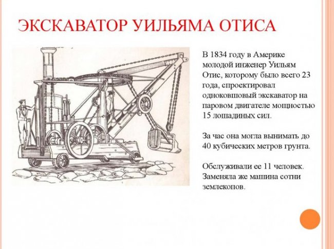Настоящей революцией стало создание первого парового экскаватора американским инженером Уильямом Отисом в 1836 году, который он назвал «крановой лопатой для выемки и удаления земли». Она представляла собой неуклюжую, громоздкую машину мощностью всего 20 л. с. с поворотом ковша чуть более на 180 градусов.