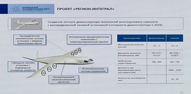 Лайнер «Регион-Интеграл» с «конвертируемым» грузопассажирским фюзеляжем сможет брать на борт до 40 пассажиров, его скорость в крейсерском режиме будет достигать 700 км/ч, а полетная дальность при полной загрузке составит порядка 2500 км.