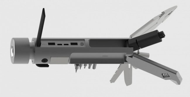 Среди прочих инструментов — плоскогубцы, гаечный ключ, консервный нож, бутылочная открывашка, нож, пила, бестопливная электрозажигалка, стеклобой, блок питания с четырьмя разъемами — 2 USB-C и 2 USB-A и насадка для сверления.