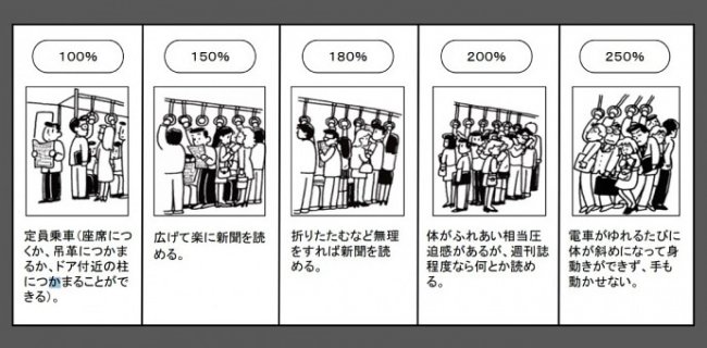 Министерство земли, инфраструктуры, транспорта и туризма Японии по долгу службы обязано постоянно мониторить степень загруженности пассажирских вагонов в метро и поездах. Для того чтобы информировать пассажиров, и для сбора статистики о работе транспортной системы. До недавнего времени для этого использовался показатель «чтения газеты», но теперь его признали устаревшим.