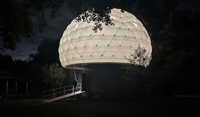 После парковки крыша раскрывается с помощью пневматических стоек и «обнажается» пробковый пол. После этого включается компрессор, который надувает большой купол с двойными стенками. Он образует дополнительную просторную спальню с надувными матрасами на шесть человек. Сюда можно попасть по лестнице из кухни или на лифте (для людей с ограниченными возможностями).