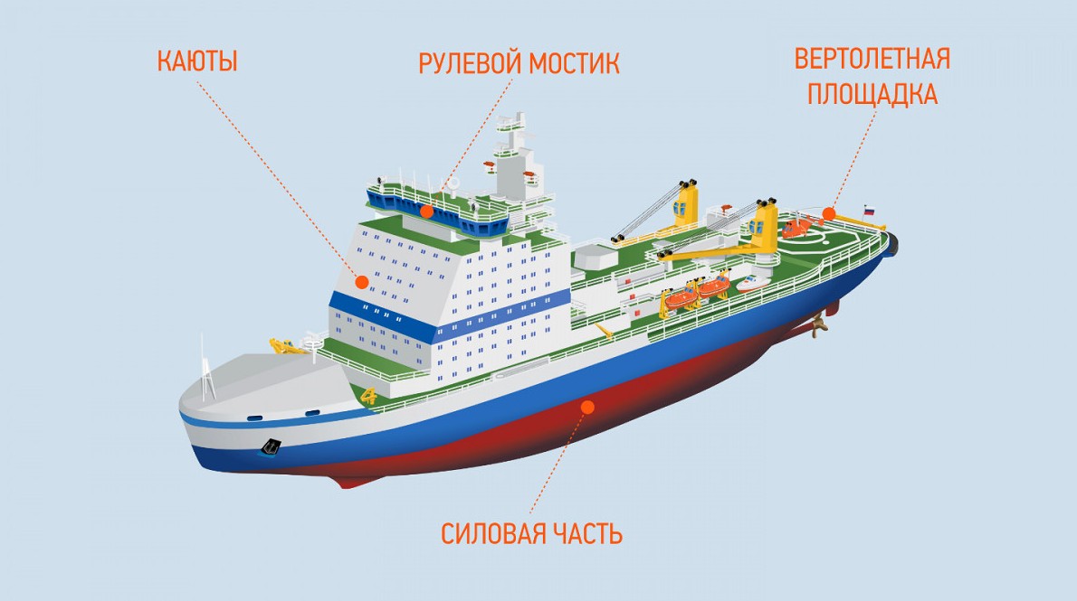 Корпус. Для создания корпуса ледокола используются толстые листы из особых сортов стали, способных противостоять льдам и низким температурам. Его нос — зона максимальной нагрузки — примерно в 1,5 раза толще бортов и кормы, чтобы на скорости выдерживать столкновение со льдом, толщина которого может достигать несколько метров.