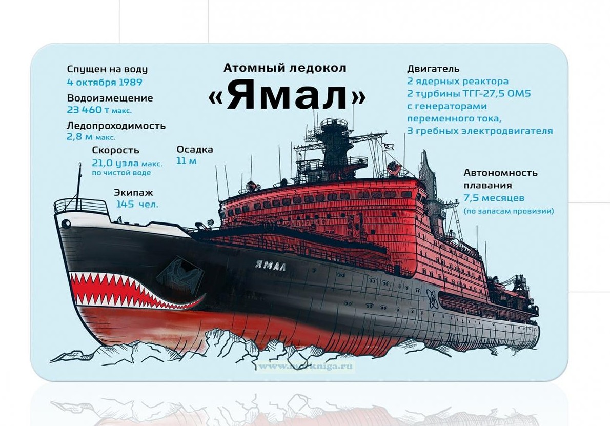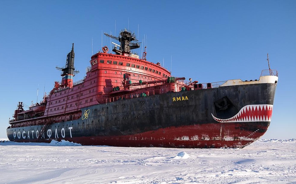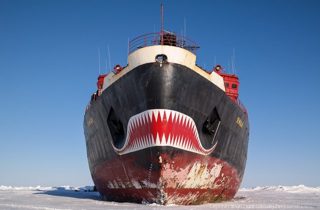 Советский и российский атомный ледокол «Ямал» уже почти 35 лет несет службу на просторах Арктики. Его визитной карточкой стало изображение хищно раскрытой акульей пасти на носу судна (некоторые называют его «акульей улыбкой»). Однако это всего лишь шутка. «Ямал» выполняет абсолютно мирную работу — сопровождает караваны с грузами по Северному морскому пути, возит туристов, участвует в полярных экспедициях на Северный полюс.