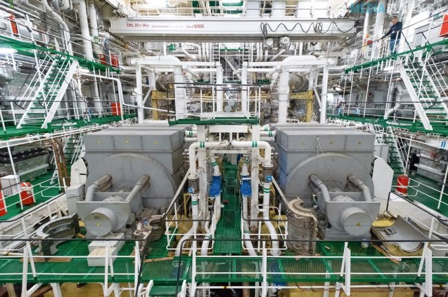 Реакторы вырабатывают тепло, нагревают воду первого контура до 300 °C. Проходя через восемь парогенераторов, вода превращает в пар второго контура, после чего пар подается на две турбины, приводящих в движение свои генераторы. На завершающем этапе энергия генераторов подается на гребные винты.