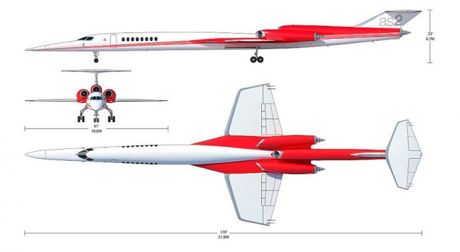 AS2 – лайнер класса «бизнес-джет» будет летать со скоростью 1960 км/ч, почти так же быстро, как его прославленный предшественник «Конкорд». В конструкции крыла, фюзеляжа, шасси и топливной системы предполагается широко использовать углеводородное волокно. Особая форма крыльев обеспечит снижение сопротивления воздуха на 20 %, что заметно уменьшит расход топлива и увеличит дальность полёта.