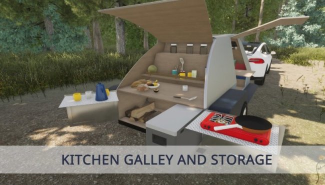 Сзади, традиционно для прицепов-капель, в отдельном отсеке сделают кухонную зону. Ее конфигурацию позаимствуют у традиционной модели Colorado Teardrops Mount Massive. В верхней части под откидывающейся вверх крышкой расположится столешница и несколько полок, а внизу за открывающимися в стороны дверцами, на которых закреплены небольшие горизонтальные поверхности — дополнительный отсек для хранения или установки оборудования.
