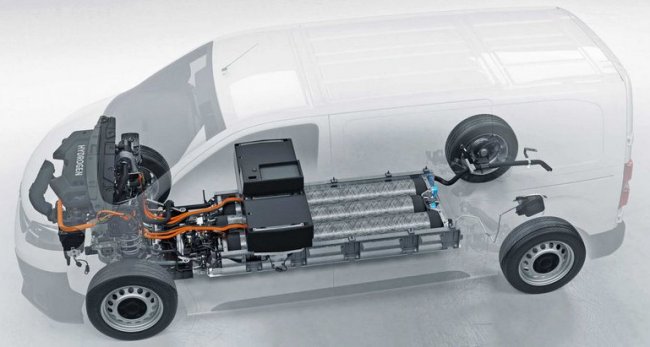 Она непосредственно обеспечивает питание электродвигателя и получает от него заряд при рекуперативном торможении. Дополнительно ее можно заряжать от внешнего источника, подключая фургон к сети как любой электромобиль. Силовая установка водородомобиля такая же, как у других соплатформенных фургонов на электротяге.