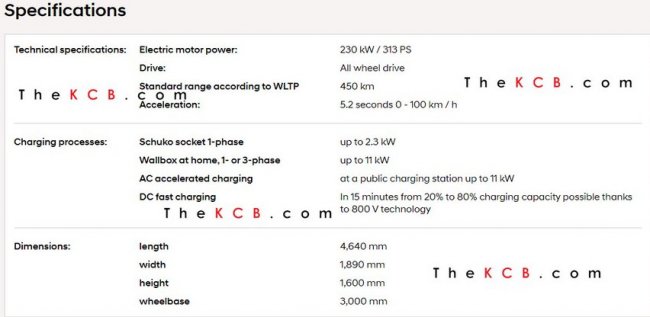 Таким образом, стало известно, что электрический кроссовер получит состоящий из двух электромоторов силовой агрегат с полной отдачей 313 л. с. (230 кВт). Момент от него будет передаваться на все колеса. Модель сможет разгоняться до 100 км/ч за 5,2 секунды и проезжать без подзарядки до 450 км в цикле WLTP с аккумулятором на 58 кВт•ч и до 550 км с батареей емкостью 73 кВт•ч. Возможно, версия с увеличенным запасом хода станет доступна не сразу после запуска электромобиля в серию.