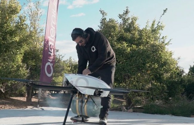 Модель разработана испанским стартапом Quaternium. Пропеллеры дрона приводятся в движение гибридным силовым агрегатом, состоящим из бензинового двухтактного мотора и электродвигателя, питающегося от аккумулятора.