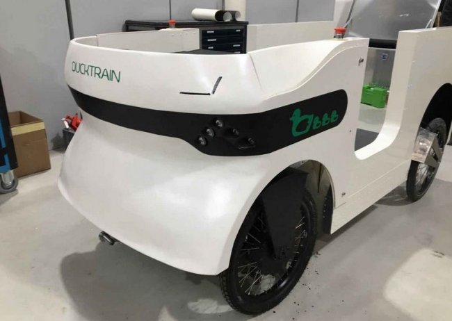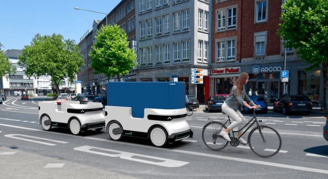 Стартап из Аахена (Германия) начал тестировать свою разработку под названием Ducktrain, представляющую собой электрический безрельсовый поезд для перевозки небольших грузов по городу. Каждый вагон вмещает один европаллет и способен автоматически перемещаться в зоне погрузки-разгрузки, следуя друг за другом без сцепки.
