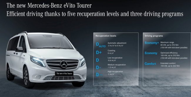 «eVito Tourer используется преимущественно как пассажирский транспорт и для перевозки делегаций, и именно для обеспечения потребностей этих групп мы предлагаем ускоренную зарядку и увеличенный пробег на одном заряде», - говорит производитель.