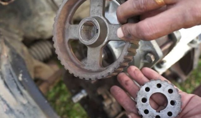 На вал электромотора установили, зафиксировав сваркой, шестерню, видимо, снятую с распределительного вала разобранного ДВС. Ее соединили при помощи обычного зубчатого ремня ГРМ с штатной шестерней коленчатого вала, который не сняли с блока. Натяжной ролик при этом не понадобился.