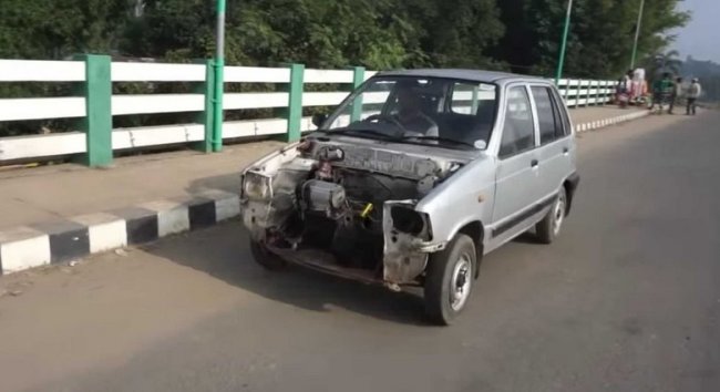 Для создания проекта потребовались: хэтчбек Maruti 800 (индийский вариант Suzuki Alto), электродвигатель, контроллер, аккумулятор, ручка акселератора для электровелосипеда и толстая стальная пластина.