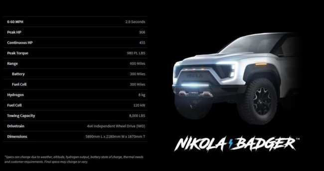 Анонсированный Nicola Motor автомобиль оснащен электрическим силовым агрегатом и водородными топливными ячейками. По данным компании, Badger отличается впечатляющим запасом хода – от 483 км только на заряде батареи до 965 км при использовании водородного топлива. Пикап способен разогнаться до 97 км/ч всего за 2,9 секунды. Разместить заказ на новинку можно будет осенью 2020 года.