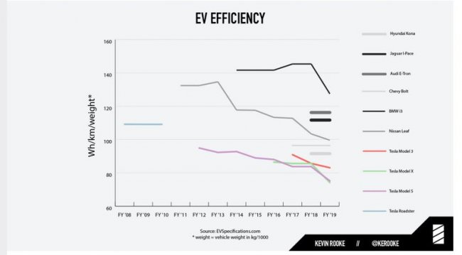Рук оценивал эффективность как показатель затрат емкости аккумулятора (Вт*ч) на километр пути в зависимости от веса автомобиля. Чем меньше нужно затратить емкости — тем лучше. Например, у Tesla Roadster, первой модели, этот показатель был в районе 110. Сейчас похожую эффективность демонстрируют Jaguar I-Pace и Audi eTron.