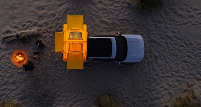 Позирует и хвастается своими способностями. Для любителей приключений предложат палатку, устроенную над основным грузовым отделением, и багажник на крыше, пользу которого объяснять не нужно. Тем не менее, электропикап стал звездой мероприятия по другой причине.