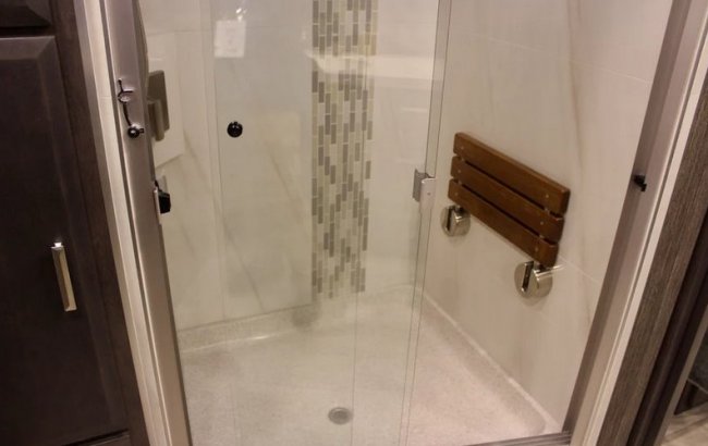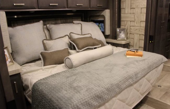 Благодаря использованию выдвижных панелей с обеих сторон Tuscany 45JA отличается весьма просторным внутренним пространством. Планировка роскошного дома на колесах включает главную спальню в задней части, просторную ванную, кухонный и спальный камины, 566-литровый холодильник. Есть возможность и установки по всей площади теплого пола, позволяющего даже зимой ходить внутри автодома босиком.