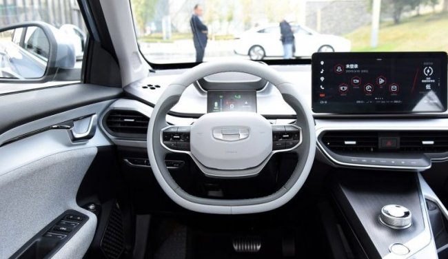 В отличие от экстерьера интерьер электромобиля вызывает больше эмоций: тканевая отделка сидений и дверных панелей, хромированные элементы, включая дверные ручки. GE11 поражает футуристичным рулевым колесом всего лишь с двумя спицами и отсутствием традиционной приборной панели под ним.