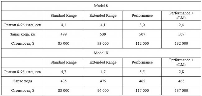 Model S и Model X «Extended Range» - это бывшие Model S 100D и Model X 100D, их цена упала приблизительно на 1 тыс. долларов. Model S P100D и Model X P100D превратились в Model S Performance и Model X Performance. Их удешевили за счет того, что убрали режим «Ludicrous Mode». Версия с ним обойдется аж на 20 тыс. долларов дороже.