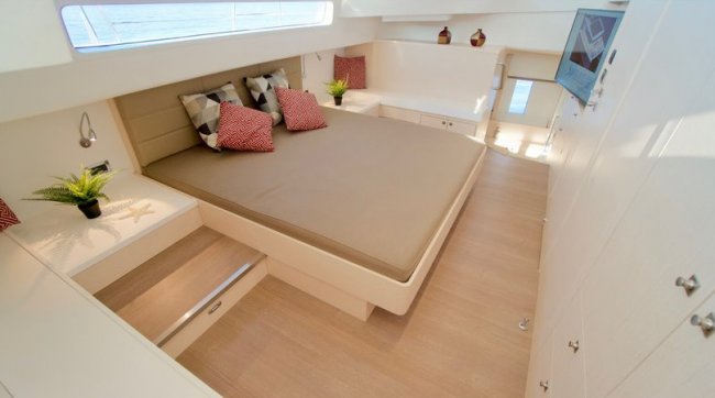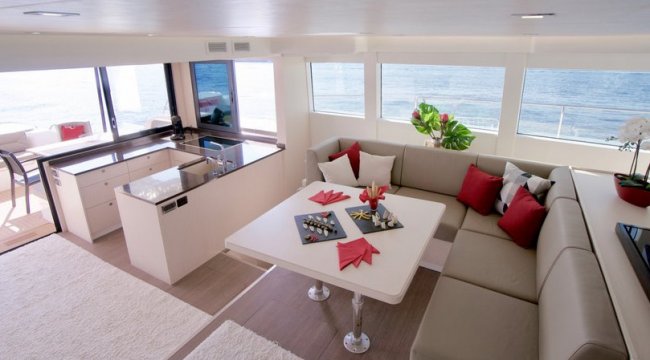 На главной палубе оборудована площадка для отдыха. Общая площадь жилого пространства – 40 м². При проектировании яхты клиент может сам предложить подходящую ему планировку интерьера. Все оборудование находится в отдельном помещении.