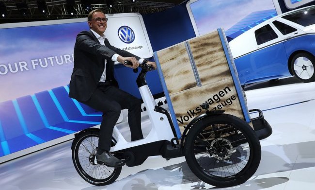 Volkswagen решила радикально переосмыслить концепцию фургона T2 Camper, представив его в виде футуристичного электромобиля для доставки товаров, в комплекте с которым может поставляться и электровелосипед.