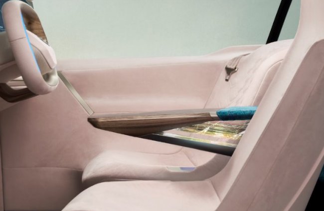 В таком дизайне экраны и кнопки становятся необязательными: интерактивными элементами служат поверхности из самых различных материалов. Например, если пассажиры на заднем сиденье захотят послушать музыку, они могут нарисовать скрипичный ключ кончиком пальца на ткани сиденья – светоизлучающие диоды в специальном полотне «Жаккард» отследят движение, распознавая символ и передадут инструкцию на бортовой компьютер, чтобы воспроизвести список композиций. А для водителя создан центральный подлокотник с элементом деревянной панели, который функционирует как поверхность HMI.