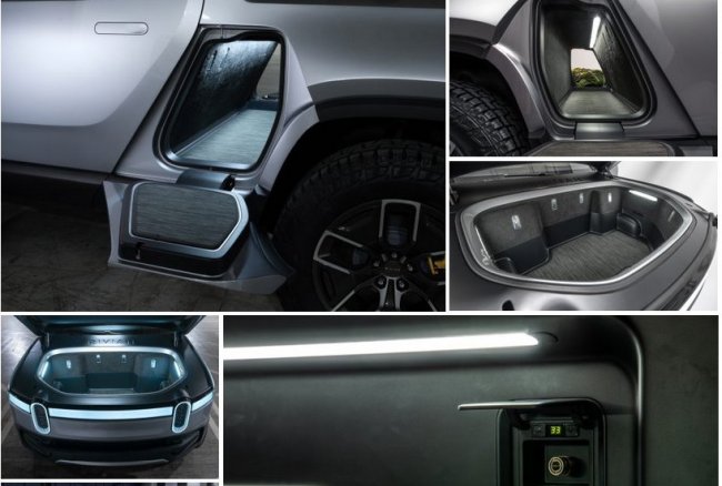 Грузоподъёмность элеткропикапа – 800 кг, кроме того у R1T имеются четыре дополнительных багажника, образовавшихся в силу специфики электромобильной компоновки: спереди под капотом – 330 л, в заднем свесе под полом багажника – 200, поперечная сквозная ниша на 350 л за задними сиденьями с доступом снаружи через боковые люки и, наконец, 95-литровая ниша под задним сиденьем (у версии с батареей на 180 кВт·ч её нет, там располагаются дополнительные элементы питания). Максимальная масса буксируемого прицепа – 5 т.