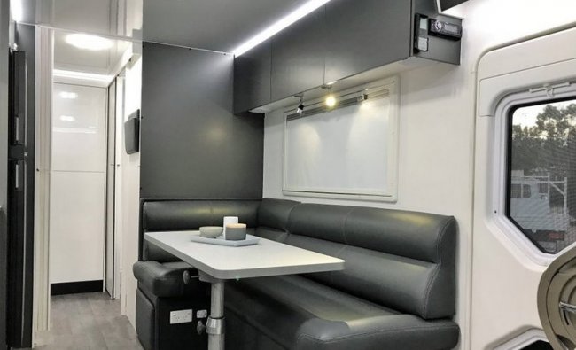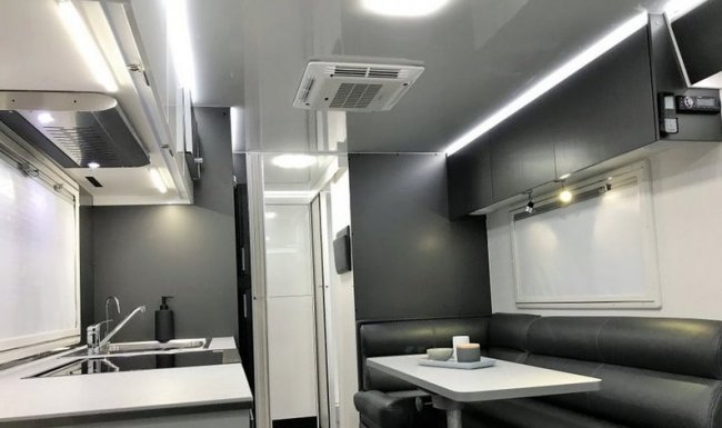Снаружи трейлер выглядит как неприступная крепость, но внутри поражает современной организацией пространства, сопоставимой с комфортом настоящего дома. Поперек комнаты встроена двуспальная кровать, посередине – складная обеденная зона, а дальше двухъярусная кровать, на которой могут уместиться до пяти человек.