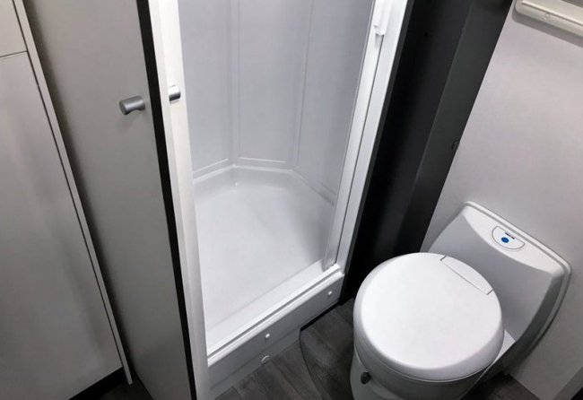 В дальнем углу, напротив двухъярусной кровати находится санузел с душевой кабиной и «сухим» блоком, где находятся унитаз и раковин, за которой встроена небольшая стиральная машина.