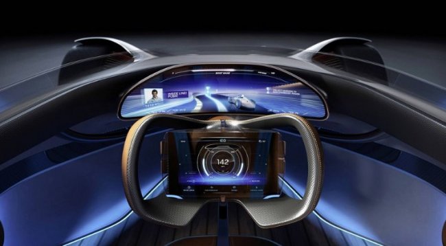 Футуристическим можно назвать не только внешний облик автомобиля, но и его интерьер. Водитель окружен панорамным дисплеем, на котором в 3D-формате отображается окружающая местность. Он предназначен для игр в виртуальные гонки и показывает на дороге полосы для беспроводной зарядки.