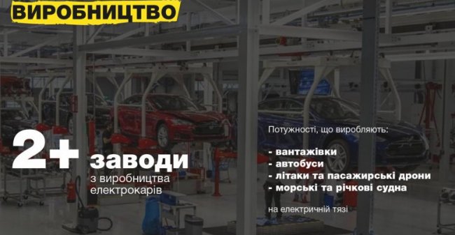 Как сообщается в презентации новой стратегии, в течении ближайших двенадцати лет в Украине должны построить два завода, которые будут специализироваться на производстве электромобилей. Также планируется создать производственные мощности для выпуска автобусов, самолетов, дронов, морских и речных судов на электрической тяге.