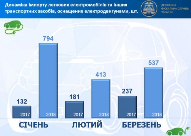 С начала текущего года в Украину импортировали 1744 машин с электрическими силовыми агрегатами. Этот показатель в три раза превышает цифры статистики за такой же период 2017-года. При этом только за последний месяц в Украину ввезли 550 «зеленых» авто.