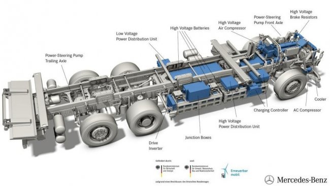 В электрогрузовиках используются передаточные системы, способные обеспечить суммарную тягу с крутящим моментом в 11 000 Нм, что повышает их производительность до уровня дизельных собратьев. Энергия от литий-ионных батарей емкостью 240 кВт*ч рассчитана на запас хода до 200 км. Быстрая зарядка (с мощностью до 80 кВт) способна зарядить аккумулятор за 3 часа, при скорости около 20 кВт на это уйдет до 11 часов.
