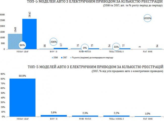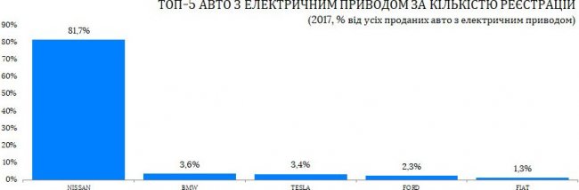 Самой популярной маркой в Украине остается Nissan Leaf, предпочтение которому в 2017 году отдали 2666 автомобилистов (доля на рынке 81,7%). На второе место поднялся электромобиль BMW i3, занимавший в предыдущем году лишь пятую позицию (117 ед., или 3,6% от всех регистраций).