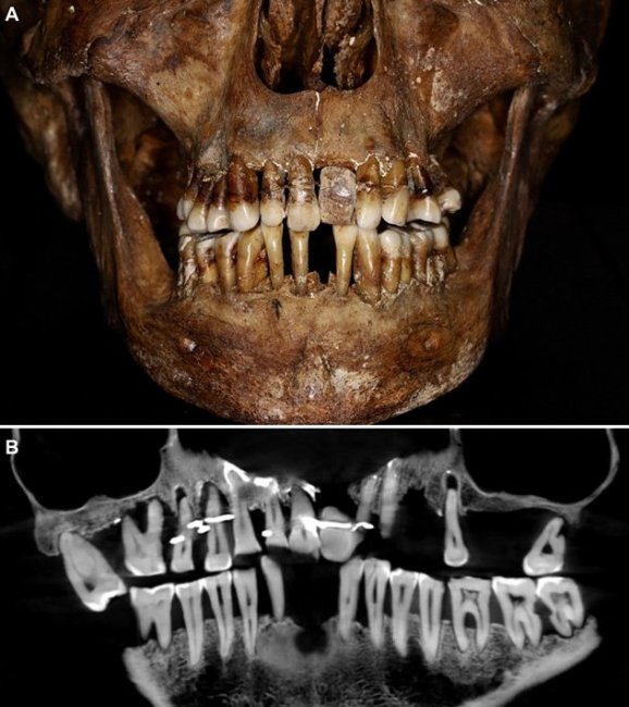 Отличным примером тогдашних протезов служат останки Анны д'Алегри, которая умерла в 1619 году и была забальзамирована и похоронена в свинцовом гробу. Их обнаружили еще в 1988 году при раскопках в замке Лаваль, и археологи сразу обратили внимание на нестандартное строение, а также очень хорошее качество ее зубов. Но тогда не было технологий для их изучения, а сегодня при помощи 3D-рентгенографии мы можем узнать секрет д'Алегри.