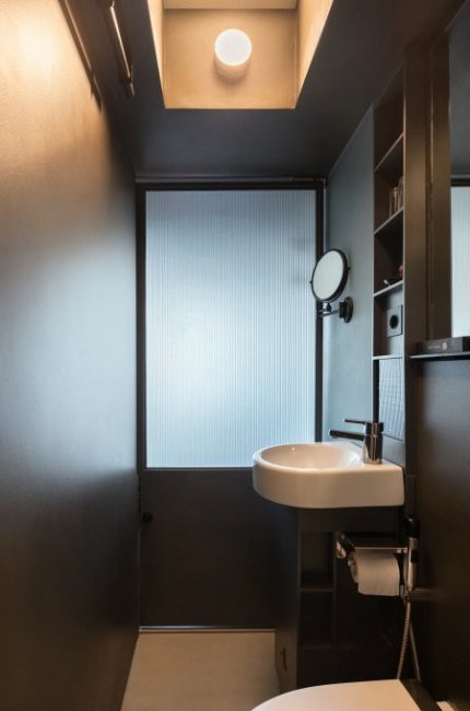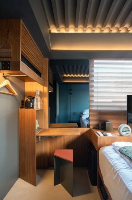 Для снижения затрат и увеличения свободного пространства внутренние перекрытия выполнены из стальной решетки. Так создается эффект «воздушности» и «прозрачности», плюс так легче вентилировать здание. Каждый номер имеет отдельный санузел и полный, хотя и минималистичный набор условий для комфортного проживания. При этом во всех номерах индивидуальный дизайн – так архитектор хотел показать, что ограниченное пространство не должно становиться ограничением для полета фантазии.