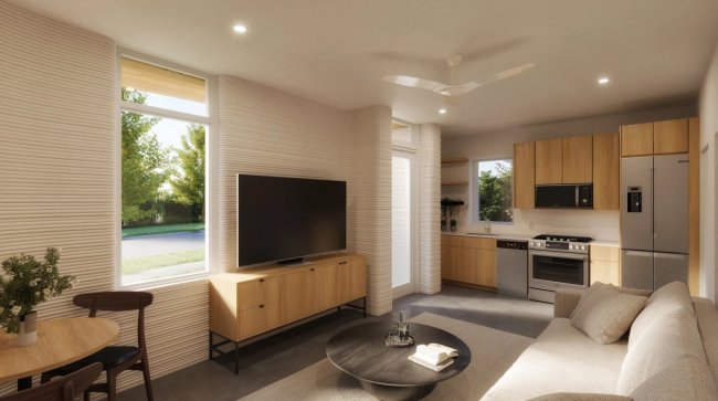 Эти объекты станут частью нового квартала в городе Остин. Строительство ведется в рамках специальной программы, направленной на обеспечение граждан доступными «квадратными метрами». Каждое из зданий займет площадь 60 квадратных метров и будет двухэтажным. На первом этаже разместятся совмещенная гостиная, столовая и кухня, создающие ощущение простора благодаря открытой планировке. Интерьер домов выполнен в современном и эстетичном стиле, а характерные рифленые стены — визитная карточка технологии 3D-печати — придают пространству особый шарм. Второй этаж отведен под спальню и санузел.