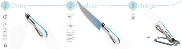 Lightsaber Knife, а именно так называется этот нож, представляет собой рукоятку, которая одним нажатием на кнопку сможет создать лезвие, которое вам сейчас необходимо. По вашему желанию ручка ножа сделает из жидкого металла одну из пяти запрограммированных форм лезвий. Для того, чтобы дети не смогли случайно пораниться, взяв в руки нож, концепт дизайна предусматривает сканер отпечатков пальцев.