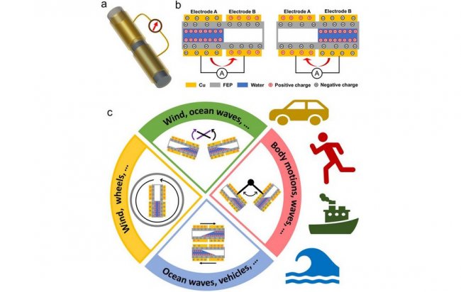 Разработка китайских ученых представляет собой разновидность трибоэлектрического наногенератора (TENG). В этом устройстве электроэнергия вырабатывается за счет трения. Источником энергии для систем такого типа могут быть прикосновение к сенсорному экрану, надавливание ногой на пол при ходьбе, скатывание капель по наклонной поверхности.