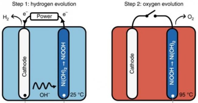 Разработанный H2Pro девайс по принципу работы похож на наиболее распространенные сейчас щелочные электролизеры. Но в отличие от устройств традиционной конструкции он работает в два этапа. Во время первого – в электролизной установке на катоде выделяется водород. При этом образующийся гидроксид-ион не участвует в образовании кислорода на катоде, а производит химические изменения в его материале, превращая гидроксид никеля в метагидроксид никеля.