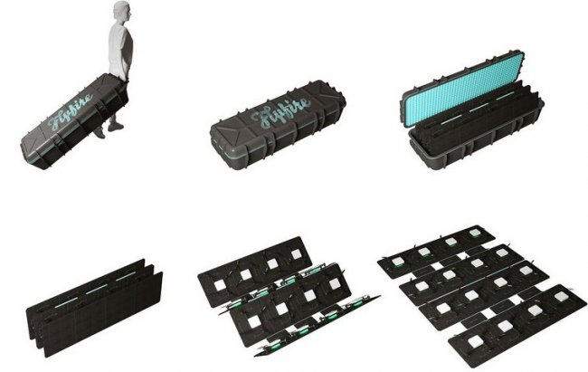 Flying Drone Blanket — это гибкая площадка с посадочными местами для шестнадцати квадрокоптеров, которые входят в комплект. Вместе с ними она компактно складывается и упаковывается в кейс, по размерам аналогичный большому дорожному чемодану.