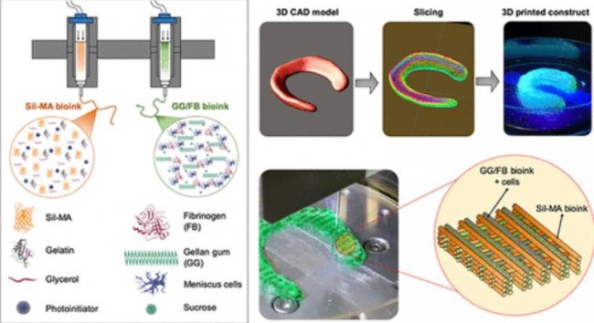 В ходе последнего исследования использовалось сразу несколько биочернил, с помощью которых была послойно напечатана волокнистая хрящевая ткань с сетчатой структурой. Первый материал — композит из геллановой камеди и фибриногена, стимулирующего возобновление роста клеток организма. Второй — метакрилат фиброина шелка, призванный обеспечить прочность и гибкость искусственной ткани.