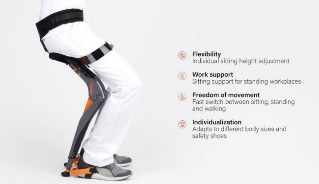 Авторы проекта назвали его «бесстульный стул» (Chairless chair). Устройство выполнено в виде легкого экзоскелета, который поддерживает нижнюю часть тела и крепится на ступнях, бедрах и пояснице. Помимо того, что работник теперь может удобно присесть в любой момент времени, конструкция девайса также облегчает ему пребывание в стоячем положении и даже ходьбу, заявляют разработчики.
