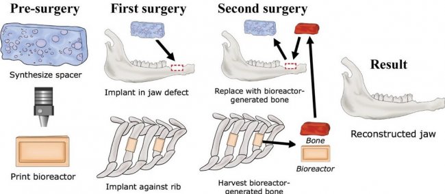 Биоинженеры из Университета Райса разработали технологию выращивания живой кости для челюстной реконструкции путем прикрепления 3D-биореактора, формы для моделирования импланта, к ребру. Стволовые клетки и кровеносные сосуды из ребра прорастают в каркас формы и заменяют его натуральным костным материалом, который не вызовет отторжения при имплантации, так как является физиологически родным для реципиента.